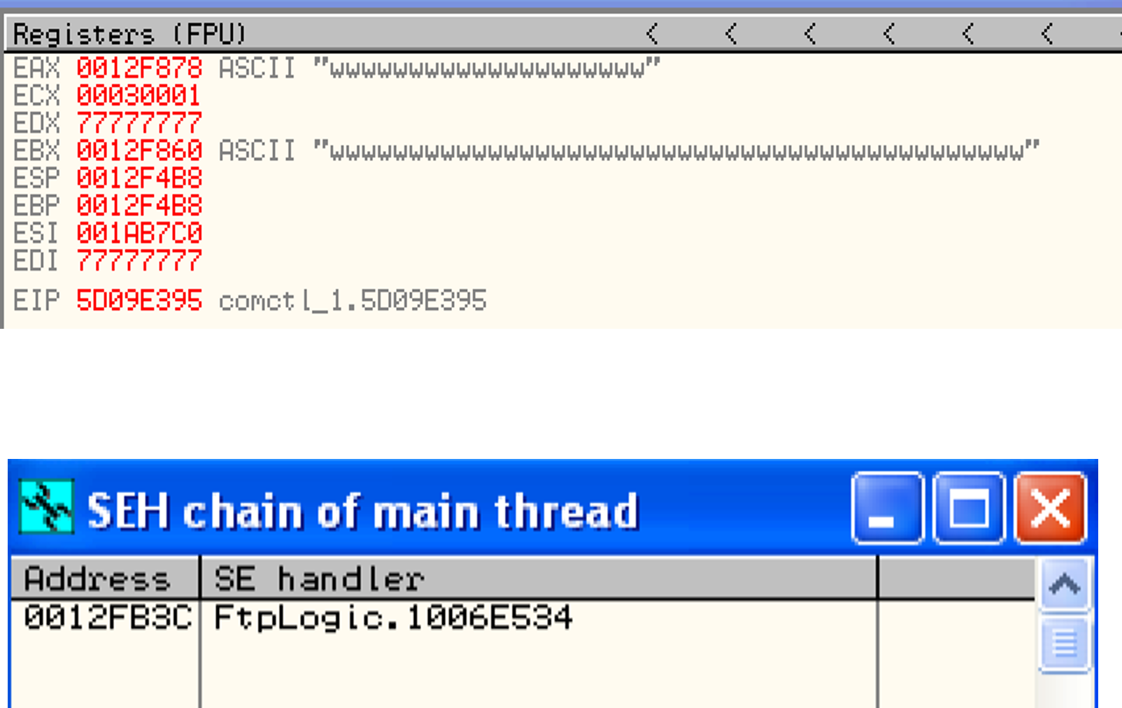 - Stack Corruption: Buffer overflow overwrites SEH chain on the stack